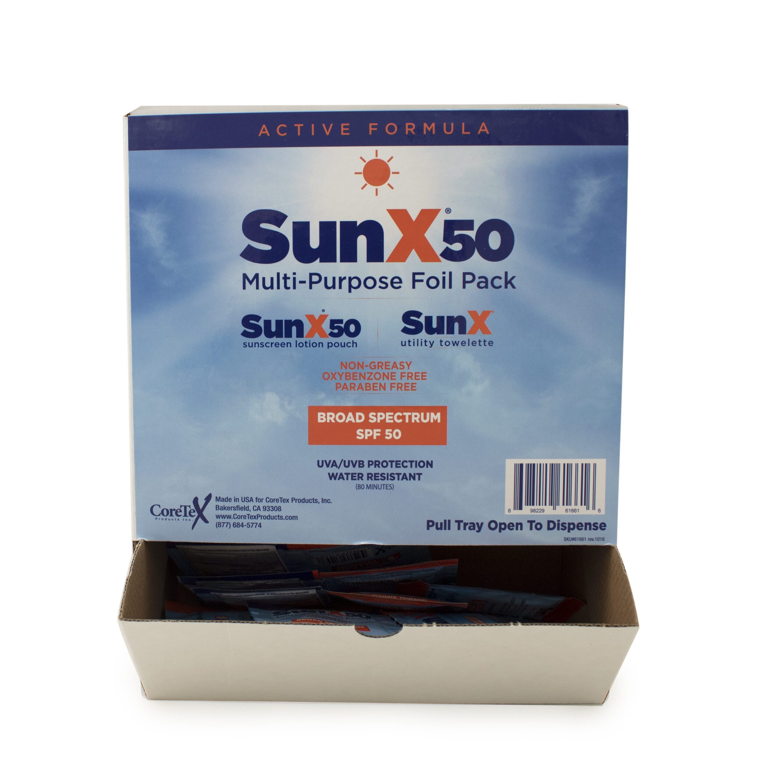 Packaged in a 50-count dispenser box, Sun X 50 Sunscreen packets are ideal for job sites, utility trucks, warehouses, construction crews, landscaping teams, road crews, and industrial settings. The compact packet design allows for easy distribution to employees without the mess of shared bottles, supporting jobsite hygiene and compliance programs.