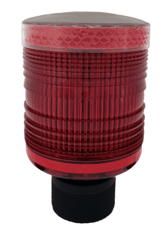 Dual retro-reflective rings located on the top and bottom enhance visibility even when the light is off, improving safety for aviation, construction, and barricade use. The threaded screw base design allows secure mounting across various barricade setups.